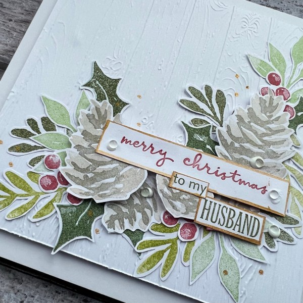 I raised a few of the pine cones up on foam to give dimension and then the sentiment I cut into strips and added some gold paint pen to the edges to add some shine. I also dotted the gold pen around the cluster.
