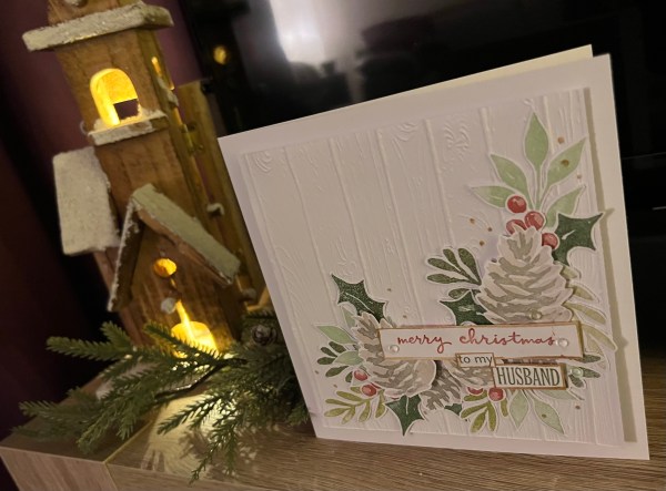 Anyways I didn’t come on here to moan but instead to share the card I made for my hubby for Christmas as I realised I hadn’t shared it yet. I also realise the only pics I have of it in daylight are before the glue had dried on the gems so it doesn’t look it’s best but hey ho that’s how it goes sometimes!