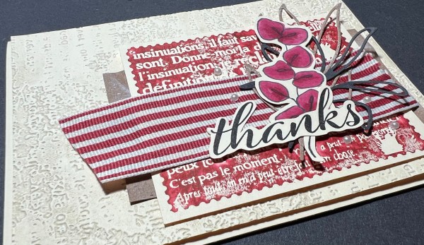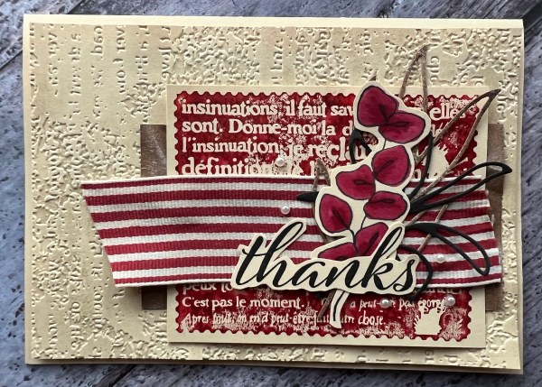 I started out with the stamped panel of vintage French print which I stamped in cherry cobbler. This is a wood mount stamp and I got it a few years ago as a good mixed media/journaling type stamp. As I am assessing the usefulness of all my crafting supplies at the moment I wanted to see how well this stamped… and as it turned out well I thought it would work for a layered element on a card and this then became the thank you card!
