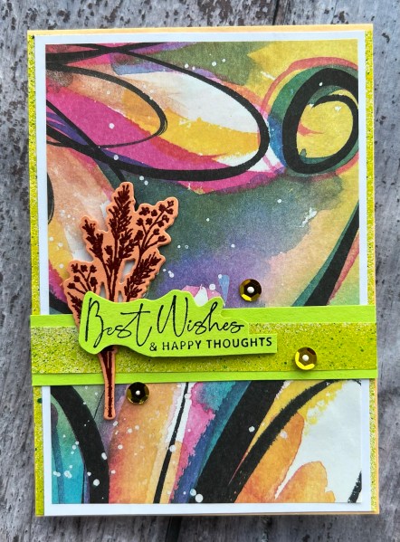 It started by me grabbing the piece of Art by Marlene collage paper and sticking it to white cardstock, then a piece of the leftover sprayed paper from last weekends photography session (see last weekends blogs for explanation). I then created a sentiment and found an embossed sprig from the Natures Prints set already made and then some gold sequins!