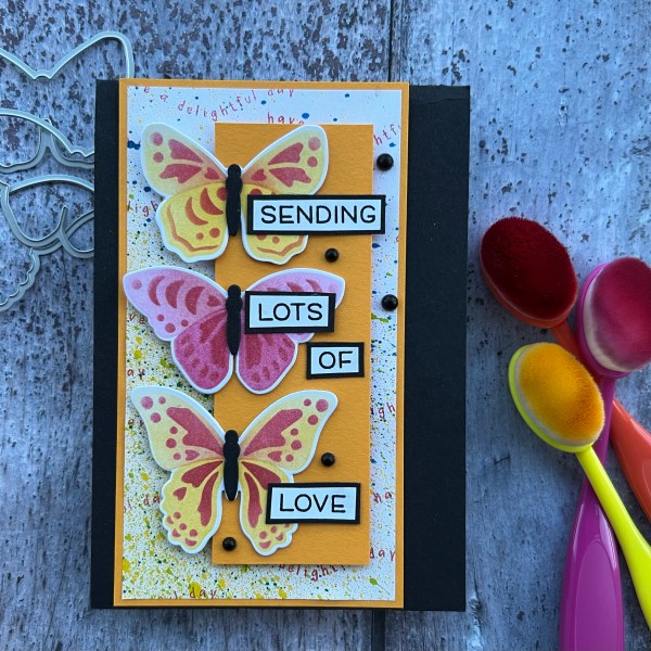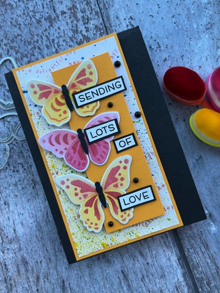 Each of the butterflies is stacked a few times and I used one of the sentiments from the stamp set to add to the background to also add in the pink colour.