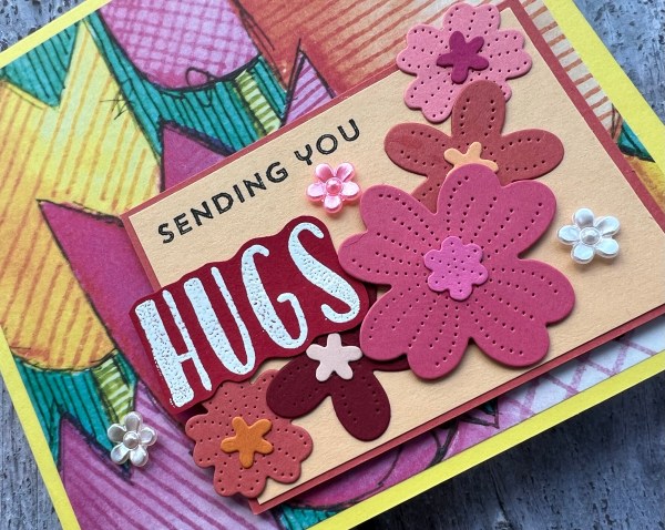 But then it needed something quite bold to work with it as the paper is so bright and so busy. So I cut some panels of cardstock and then used die cuts to tray and create a focal point above the busy background. I think this along with the stamped and embossed and fussy cut sentiment worked quite well.
