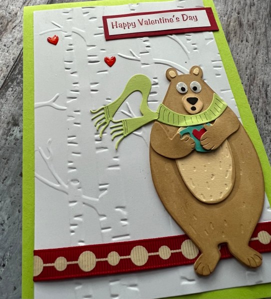 I chose to emboss the background using the woodland folder and then added a ribbon and two of the extra heart die cuts from the set.