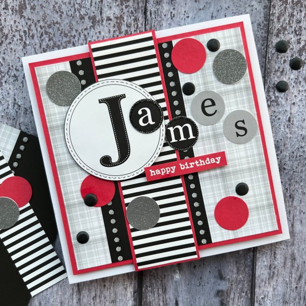 Given male themed cards and teenager cards are not my go to make I am pleased with this one … I used a stack of paper from DCWV which has some encapsulated glitter but isn’t overly sparkly. It also has alphabets as the theme so grabbed the large J and then the rest of the letters from another piece and this created the focal point of his name. I then built up around that with punched circles and card candi.