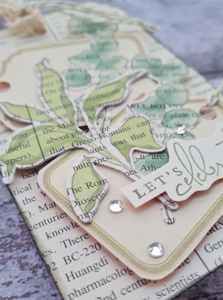 So as I had the dictionary print paper there I started by covering a piece of sturdy card in the paper at a slight angle and then cut out the tag shape. I then chose two of the labels that were tag shaped, punched a hole and threaded some twine through. I raised these on foam and added them as background to the main images.