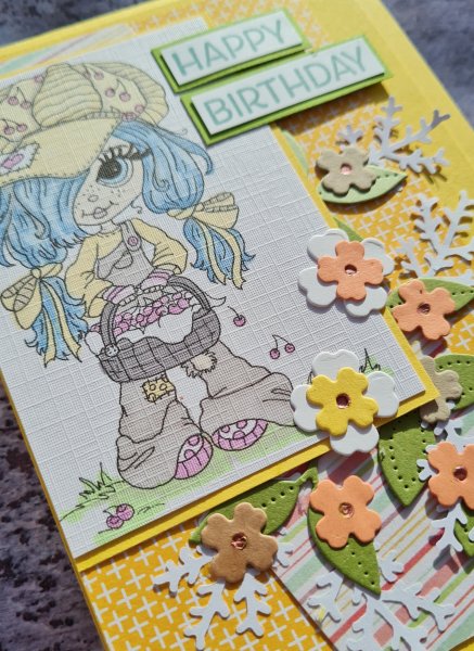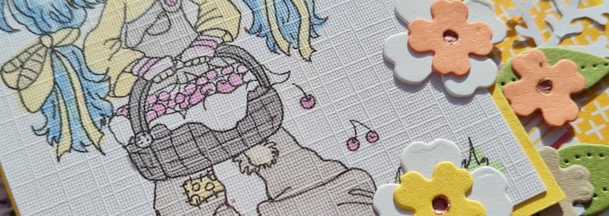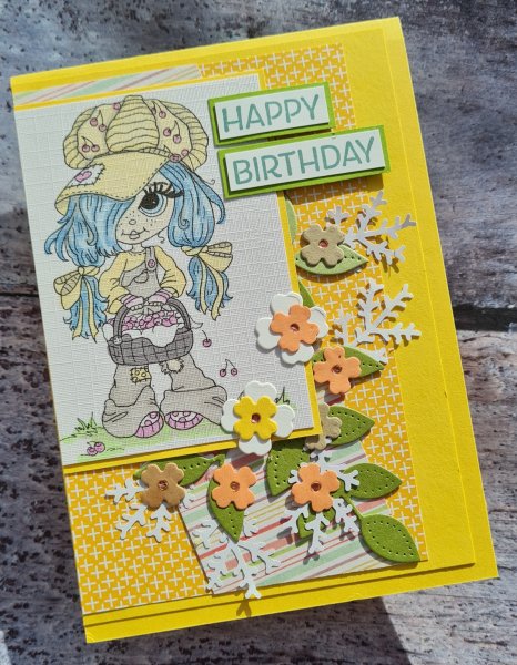 Today I have a card I made for the Happy Little Stampers Anything Goes with Dies challenge design team using lots of the little flowers from Wreath Builder Dies and the leaves from Pierced Blooms dies with a cute digital image that has been printed and coloured in my stash for ages!