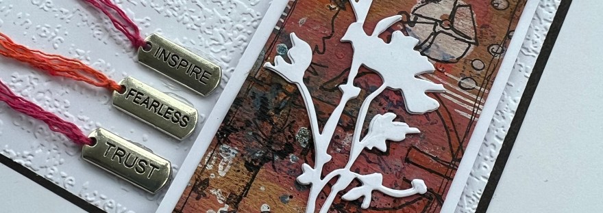 A slimline panel mounted onto white with a white die cut flower on the top (stacked three layers of die cuts to give it strength). Kept the background quite simple with an embossed panel using the Old Paper embossing folder. Mounted that onto black.