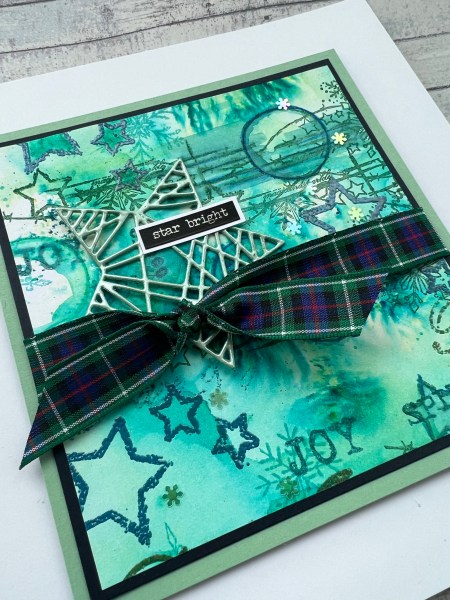 I decided to add this lovely tartan ribbon and then one of the fancy stars from the Trimmings and Tidings set … I die cut this from the soft sea foam cardstock twice and then embossed it with a pearl embossing powder so it’s a really pretty embellishment.