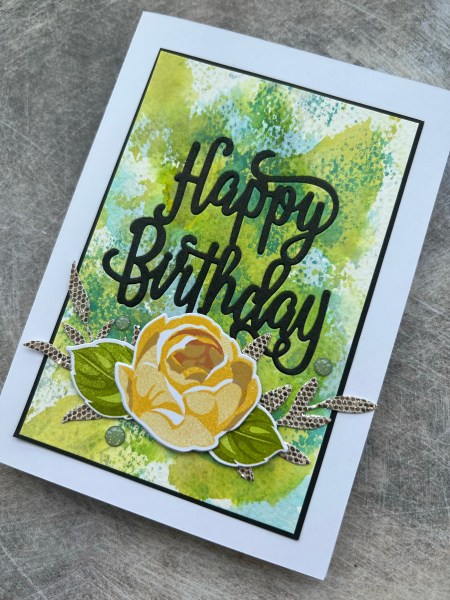 Next I took some leaves I had die cut from the glitter cardstock scraps using the Zero Waste leaf die and added those to the space underneath the sentiment. I wasn’t sure what central element to add but then remembered all the yellow roses I had already stamped and die cut so used one with two leaves to finish off. I did have to add some foam under the centre of the rose as the leaves are also stacked die cuts and it was wobbly otherwise.