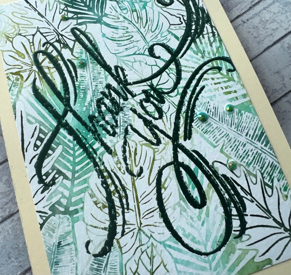I had created the background way back … when I made this card and then set this one aside. All I did was trim the background and heat emboss the sentiment from Stampendous in a rich emerald green powder and then add some gems. Mounted it onto a cream blank and jobs a good’un!!!