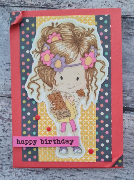I decided to cut round the image to give it a white halo and then stick directly onto a mix of patterned papers. I particularly love the dotty one with all those cool colours. So as I had coloured the girl in a mix of bright colours this worked fab. I grabbed some Sweet Sorbet cardstock and made my cardblank and then thought it would be good to do the peep of the paper at the edges by curling it back and this created both some dimension and interest.