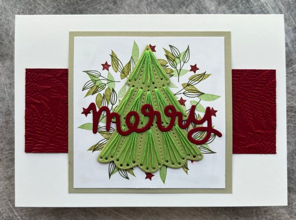 I added the tree over the top and then the die cut Merry. To tie the elements together onto the 5×7 cardblank I added a strip of the cherry cobbler cardstock which I embossed with the fern folder.