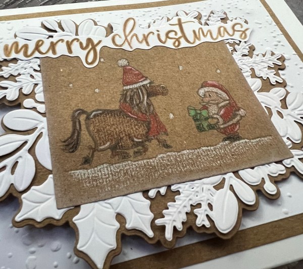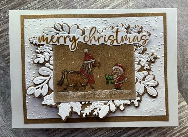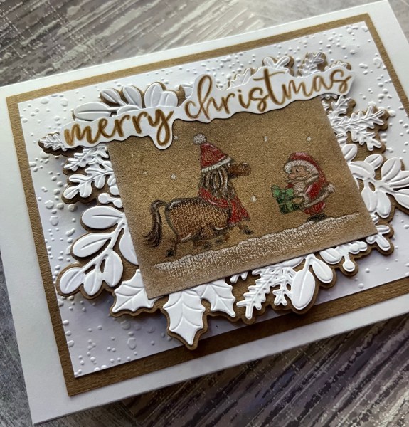 I edged the die cut rectangle with a little white Kraft ink … not much … but it was enough to soften the edge of the panel. Then I had fun grabbing the merriest moments embossing folder and die set to create the panels underneath. I decided to then go with a panel of white embossed snow and the mat of the Kraft to finish off the card topper as it needed the additional frame I thought to ground the images.