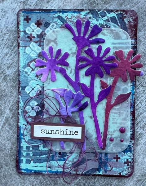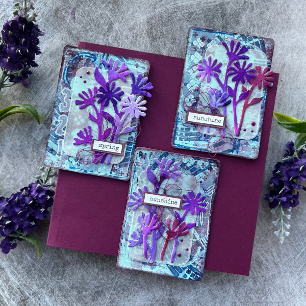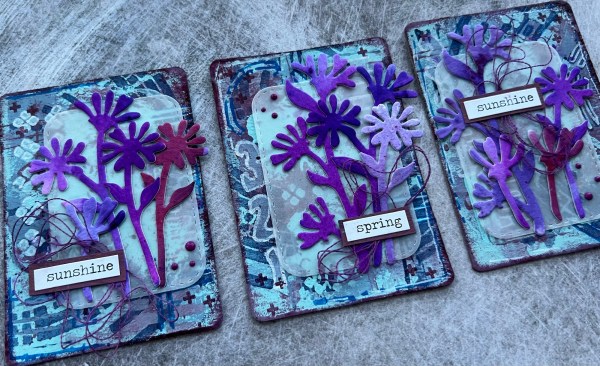 After making the three backgrounds I added die cut vellum and the flowers that I die cut from some watercolour cardstock I had coloured using both the Dylusions spray ink and brushos giving them different purple colours.