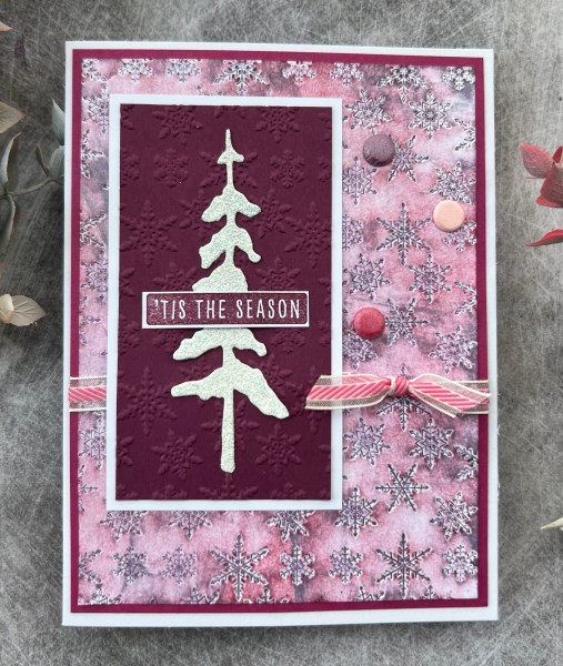 I inked up the embossing folder with a dark purple and then embossed it. This pushed the ink into the debossed snowflakes. Then I used a pink and lilac ink pad to swipe over the top and a little spritzed water to just blend a little.