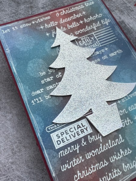 The focal feature of the tree is actually three die cuts which again have been in the stash a long time. I stacked them up for dimension and added a coat of sparkly embossing powder to give it texture and shine/sparkle!