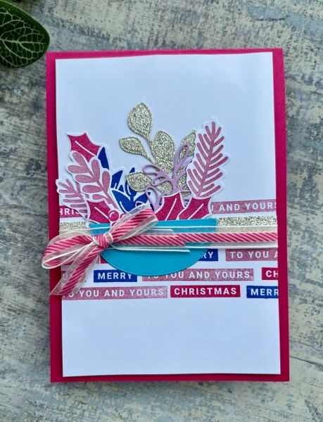 I started with the stamping of the words on a panel of A5 and chose pinks and purples because I thought I would use the lilac word background dies I had already stamped but then changed my mind completely. So for at least half an hour I pulled out lots of different things to try and then ended up creating a floral cluster in a vase and loving the very non traditional cards I made!