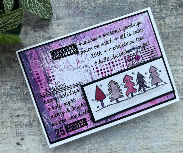 Let’s start with this one … the rub on element was done a while ago for both cards and then these just sat in the box of ready made backgrounds to play with in future. Well when I came across the little Darcy Paperartsy trees I stamped and set aside I decided they were perfect for these backgrounds when watercoloured with matching colours.