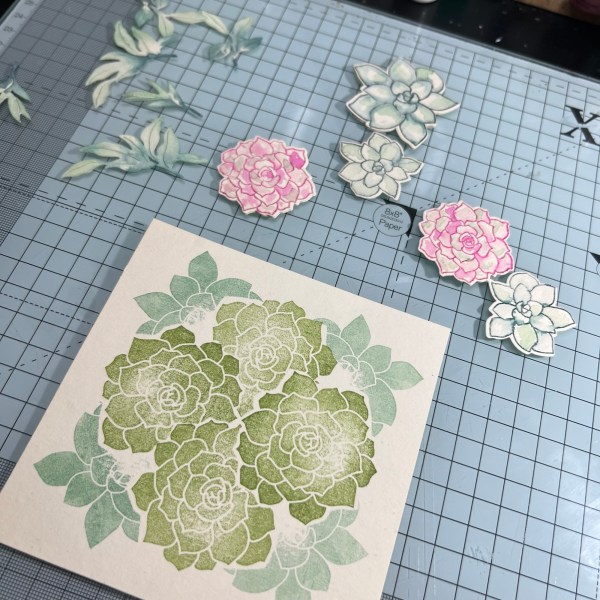 I used some new to me stamps and dies to create this that I bought in a sale of old stash from Waffleflower through Seven Hills craft. This set was called Succulent and there are a few solid stamps and some outline succulent images as well as some sentiment/word stamps.