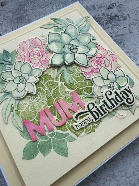 I stacked up those succulent die cuts to give dimension and then adhered them in place. For the sentiment I used an Altenew one for the happy birthday, and then playful alphabets dies to create Mum which I coloured in pink.
