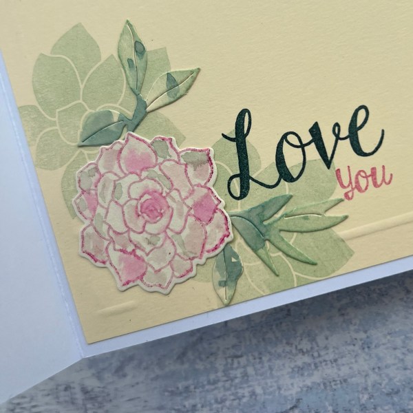 Inside the card I added another panel of cream and stamped some of the solid images and then added some of the die cut leaves and one of the die cut succulent images I had water coloured.