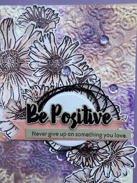 I then worked on the sentiment cluster with the stamps from the set. I embossed the Be Positive with the same purple embossing powder and then stacked the die cut up a few times.