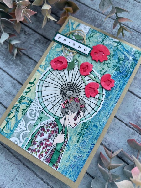 I then used a Japanese stamp I’ve had in the stash a long time (no idea what it says so I hope it’s nothing offensive!) and embossed that in the background with a green powder.