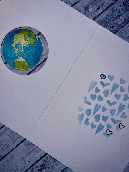 I decided the world would be a perfect stamp to make a spinner card. I saw Jennifer Maguire make one recently on a live she did with Kristina Werner (whose new line of stamps, stencils and dies I adore and am longing to buy but can’t quite justify the spend at the moment!) and really wanted to have a go at it!