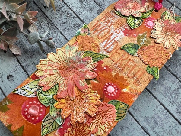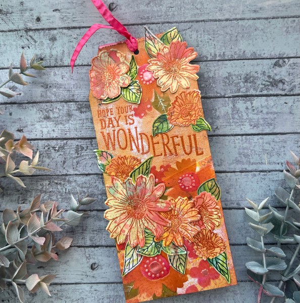 I added the flowers and leaves on top around the tag to create the texture and with all the colour in the gelli prints they are stamped on and the shiny embossing they make pretty funky flowers and leaves I think!