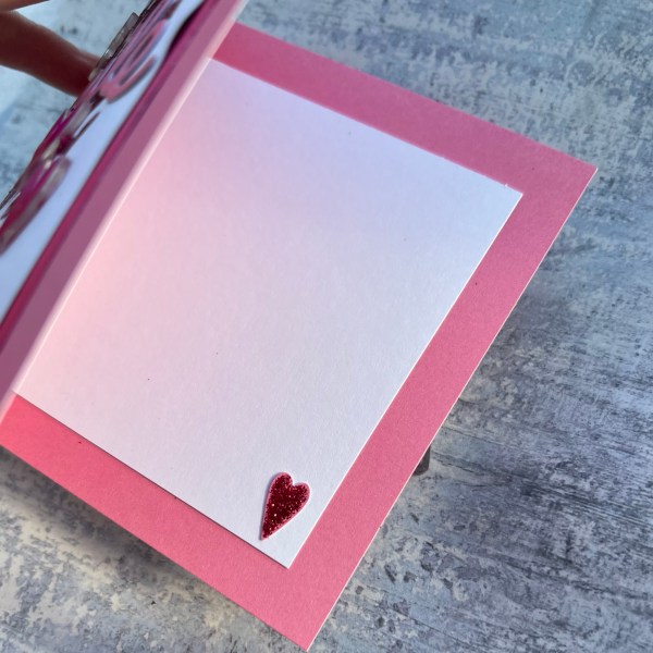 I added a little interest inside the card with another panel of the white and then I punched a heart from the same colour pink cardstock and added the glitter to that so it all tied in!