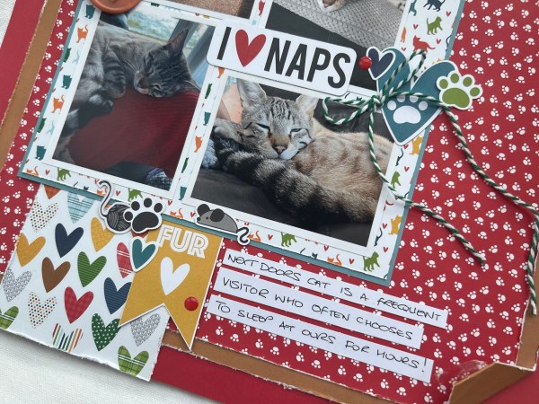 I added in lots of the embellishments from the kit including the I ❤️ NAPS title piece and enjoyed putting them together in the three clusters. I also added the twine bow for some different texture.