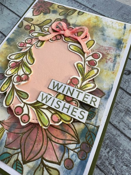 I used the panel I made months ago and those bits and bobs I had made at the time. I added a peach oval to rise up above the background and then added the peach bow.