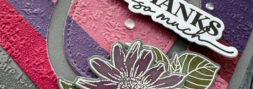 I started with just some strips of the pinks and purples and then decided on the pale grey base. I made up the front panel and then die cut the oval before putting it back in place and deciding to emboss the embossing for the full panel.