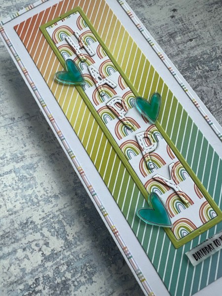 I decided to cut another panel of the slimline papers – this time the diagonal rainbow stripes and then cut another frame from one of the other papers that had a mix of the rainbow colours and stuck that down on the edge of the slimline card.