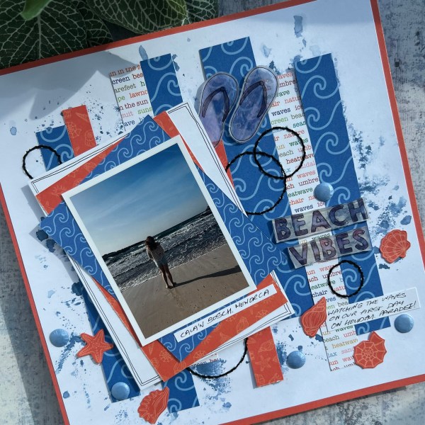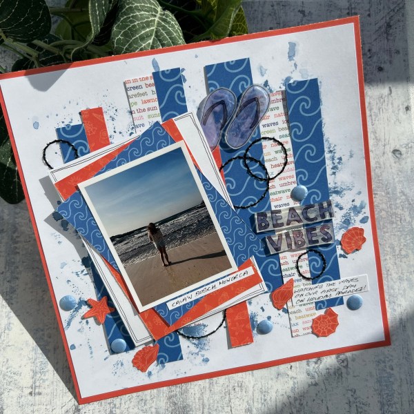 I added the shrink plastic Beach Vibes words and the flip flops too as embellishments too – and then some blue card candi too. I added in a bit of the journalling onto some white.