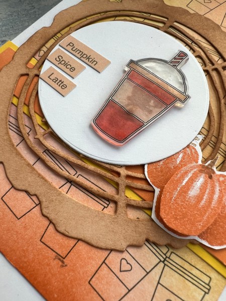 For this card I really wanted to represent the PSL joy! Not sure what I mean – well Pumpkin Spice Latte is one of my go to treats as soon as the coffee shops start selling it. It’s a hideous amount of calories though so I’ve try to limit myself but do miss it when it’s not available anymore! Also I love it iced as well as hot so when I saw these shrink plastic images that was what came to mind!