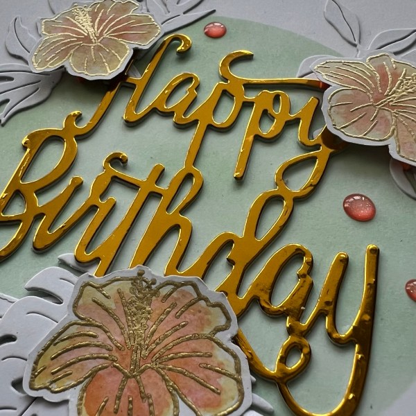 A 7×7 card on which I blended a circle through a clarity stamps stencil. I chose a soft green ink and then decided to use white die cuts for the tropical leaves rather than green – I just thought it gave a different look!