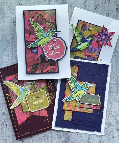 I decided to try and keep things easy for myself by using the same focal image for all the cards – the hummingbird. So I stamped all the birds and coloured them all as one thing and then cut them out – this made the assembling part of the cards easier. I did colour them in different ways though to make them a little different and enjoyed putting some different techniques to the test.