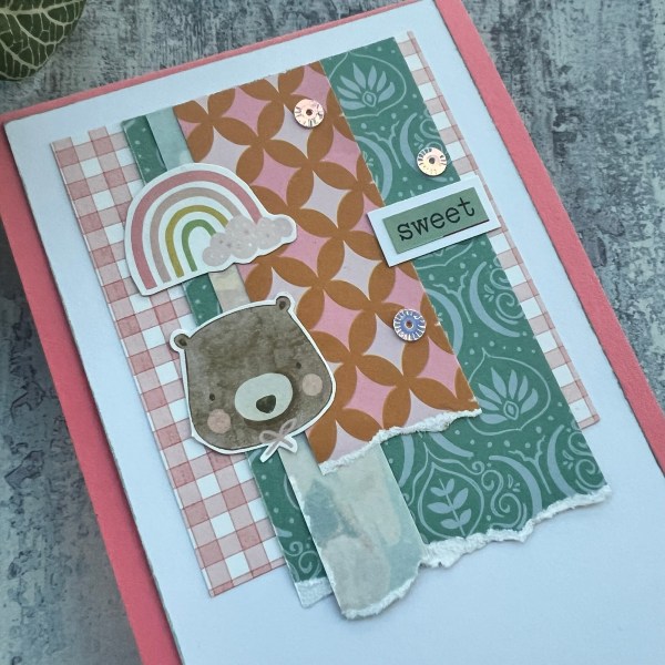 I did wait until I got home to get the pink card blank made up to add the topper to – but I managed to fussy cut the images and the word from scraps and then layer up the little leftover bits to make a cute baby card.