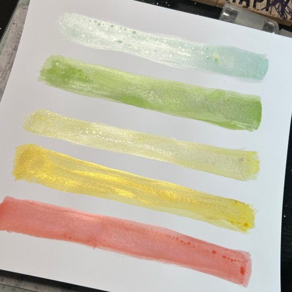 So I painted five of the colours of the spray across the page. I was quite generous with the painting so you can see there are some spots where the shimmer is quite concentrated. I love this because it adds to the texture too.