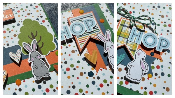 I used lots of dimension for the elements I added. I pulled in twine and the gems from the kit and the second two also had banner stickers which I used by adding them to the orange card and cutting them out for a different texture.