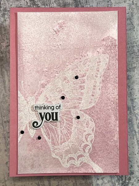 I wiped the spray off the stamping so it stayed white for the finish – but in some light it is very subtle and the shimmer has created its own texture to the cardstock too!