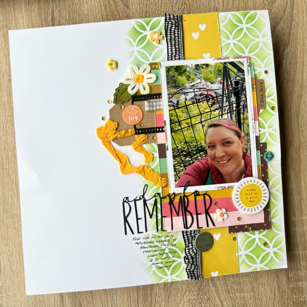 I started with this page and although I didn’t exactly follow the instructions – it is similar to how the page was designed. I did have to change up the title and a couple of embellishments to make it work with the photo – but it was very close to the original – to the point where friends were wondering what was wrong with me as I’d not gone off piste! 🤣