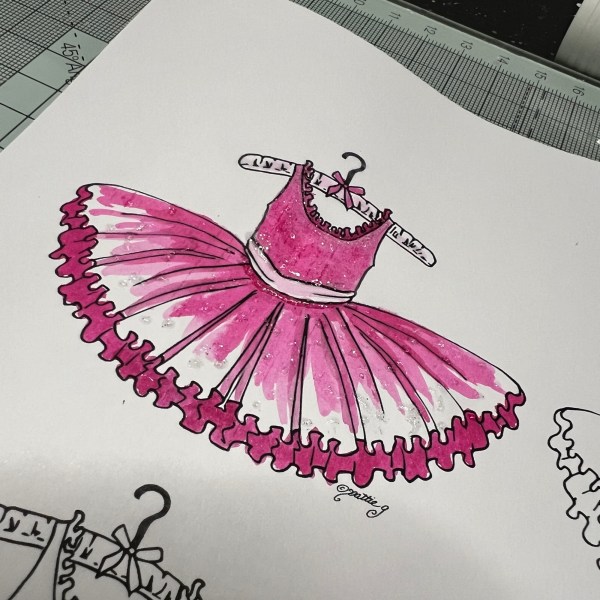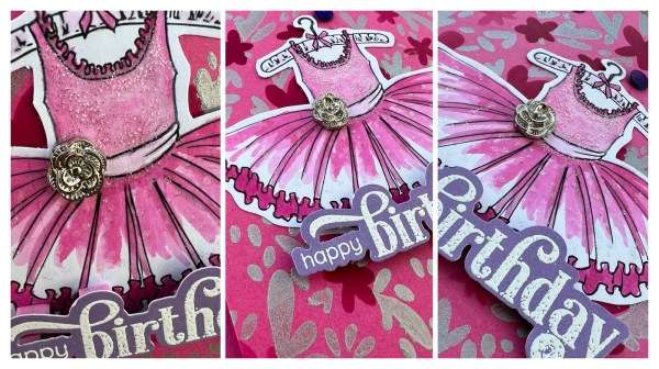 Once the paint was dry I added the dress with glue to the front and then added some flat sequins as embellishments where I felt the background had some gaps.