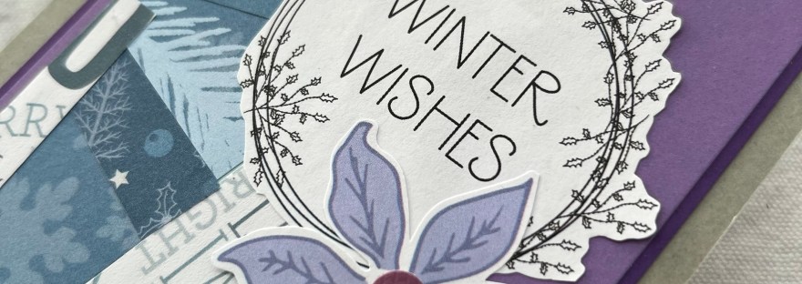 I think I prefer this particular effect (and it was easier to do). Along the edge I then added the two flowers and the sentiment circle element. I wish I had added dimension behind the panel and the flowers but in this case I stuck it down onto the two mats of lilac and purple before adding to the card blank.