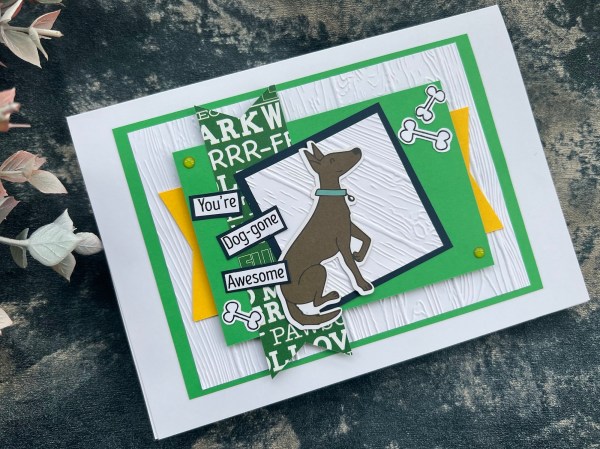 I added three different colours of cardstock to go with the papers (as I had no solid left in the kit I just went with random cardstock from the stash) and created these bright dog themed cards using the embellishments in the kit and some other bits and bobs.