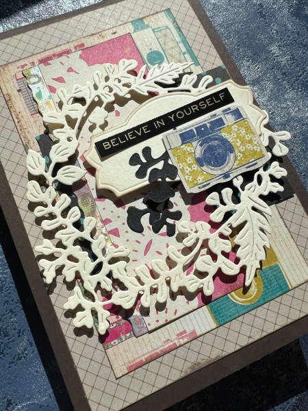 I chose the Natures Prints die cut wreath, some sprigs and the label. I added foam adhesive behind the wreath to give it some dimension and then used the last bit of the camera paper to fussy cut a camera out – this was the last complete image I could cut out – I think I have used the paper well!