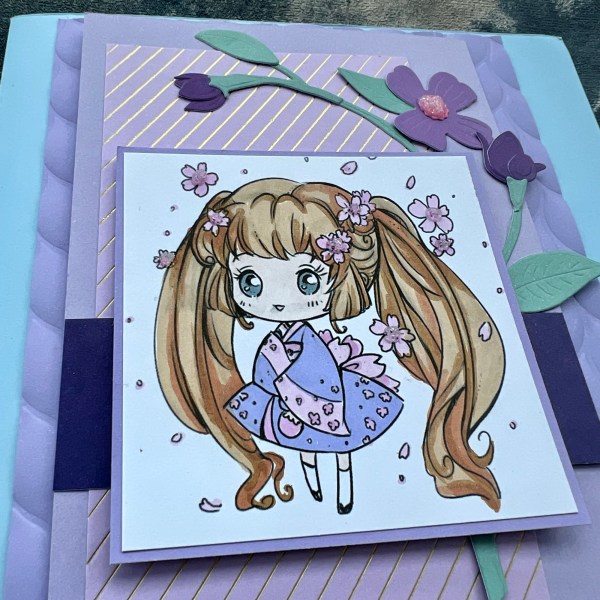 After colouring the image using my promarkers I chose layers of lilac, blue and deep purple. One of the layers I had tested a new to me foiling plate with the gorgeous fine diagonal lines on and I thought it made a nice touch!