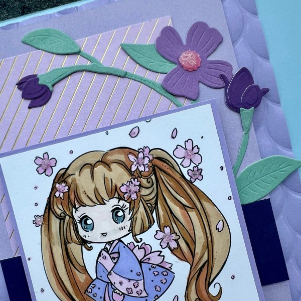 For the die element I added a floral element I die cut from the scraps in the scraps pouch but keeping to the theme of the card I kept with purple flowers and then a nice soft green stem and leaves.