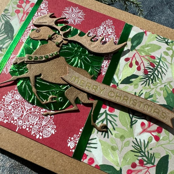 Next die cut the label from the foiled cardstock and then embossed it with an old magazine kit folder. This distressed the foiling but I think it looks great with the white peeping through the shine – especially as I knew most of it is covered by the moose die cut.